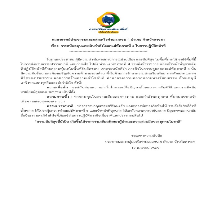 ขอบพระคุณพี่น้องประชาชนจังหวัดสงขลา (จะนะ เทพา นาทวี สะบ้าย้อย) สำหรับถ้อยแถลงที่เปี่ยมด้วยกำลังใจ เจ้าหน้าที่ทุกนายขอน้อมรับด้วยหัวใจ และพร้อมจะมุ่งมั่นปฏิบัติหน้าที่อย่างเต็มกำลังความสามารถ
