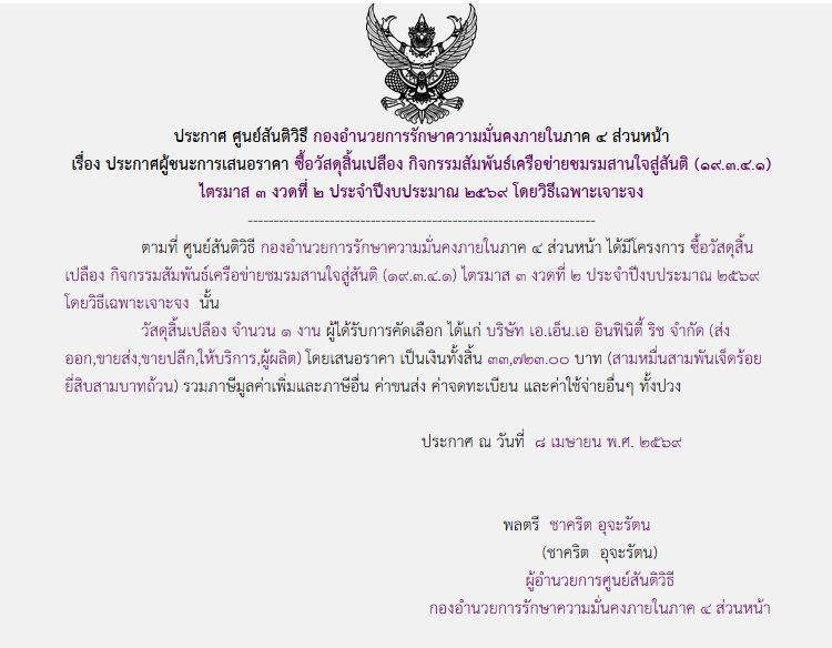 จัดซื้อ จัดจ้างประกาศผู้ชนะการเสนอราคา ประกาศผู้ชนะการเสนอราคา ซื้อวัสดุสิ้นเปลือง กิจกรรมสัมพันธ์เครือข่ายขมรมสานใจสู่สันติ (๑๙.๓.๔.๑) ไตรมาส ๓ งวดที่ ๒ ประจำปีงบประมาณ ๒๕๖๙ โดยวิธีเฉพาะเจาะจง April 17, 2026 10 Share Facebook Twitter Google+ Telegram LINE