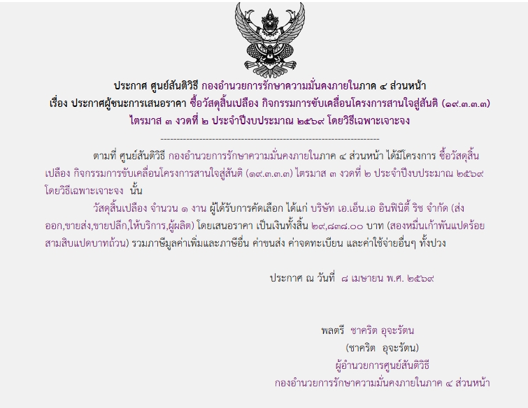 จัดซื้อ จัดจ้างประกาศผู้ชนะการเสนอราคา ประกาศผู้ชนะการเสนอราคา ซื้อวัสดุสิ้นเปลือง กิจกรรมการขับเคลื่อนโครงการสานใจสู่สันติ (๑๙ ๓.๓.๓) ไตรมาส ๓ งวดที่ ๒ ประจำปีงบประมาณ ๒๕๖๙ โดยวิธีเฉพาะเจาะจง April 17, 2026 10 Share Facebook Twitter Google+ Telegram LINE