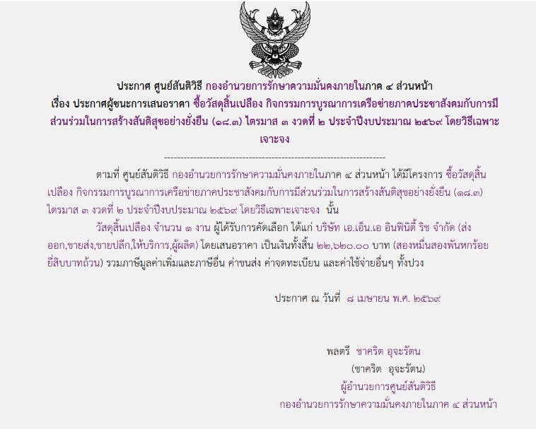 จัดซื้อ จัดจ้างประกาศผู้ชนะการเสนอราคา ประกาศผู้ชนะการเสนอราคา ซื้อวัสดุสิ้นเปลือง กิจกรรมการบูรณาการเครือข่ายภาคประชาสังคมกับการมี ส่วนร่วมในการสร้างสันติสุขอย่างยังยืน (๑๘.๓) ไตรมาส ๓ งวดที่ ๒ ประจำปีงบประมาณ ๒๕๖๙ โดยวิธีเฉพาะ เจาะจง April 17, 2026 6 Share Facebook Twitter Google+ Telegram LINE