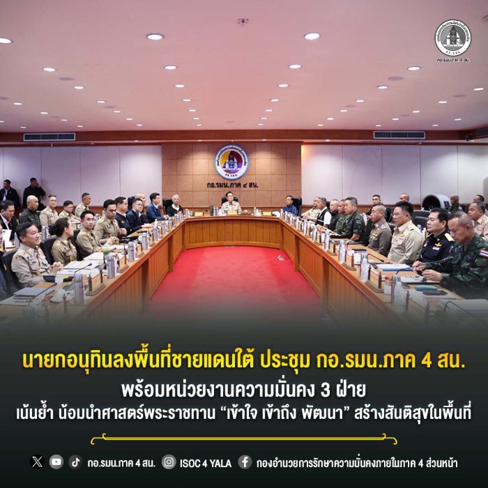 นายกรัฐมนตรี ย้ำว่า การแก้ปัญหาในพื้นที่จังหวัดชายแดนภาคใต้นั้น ต้องแก้ที่ “ต้นเหตุ” ควบคู่การบังคับใช้กฎหมายอย่างจริงจัง ผ่านการบูรณาการทุกหน่วยงาน โดยเฉพาะ กอ.รมน.ภาค 4 สน. เพื่อสร้างเอกภาพและขับเคลื่อนสันติสุขอย่างยั่งยืน พร้อมยืนยันว่ารัฐบาลพร้อมสนับสนุนเต็มที่ และการลงพื้นที่ครั้งนี้เพื่อสร้างขวัญกำลังใจให้กับเจ้าหน้าที่และพี่น้องประชาชน