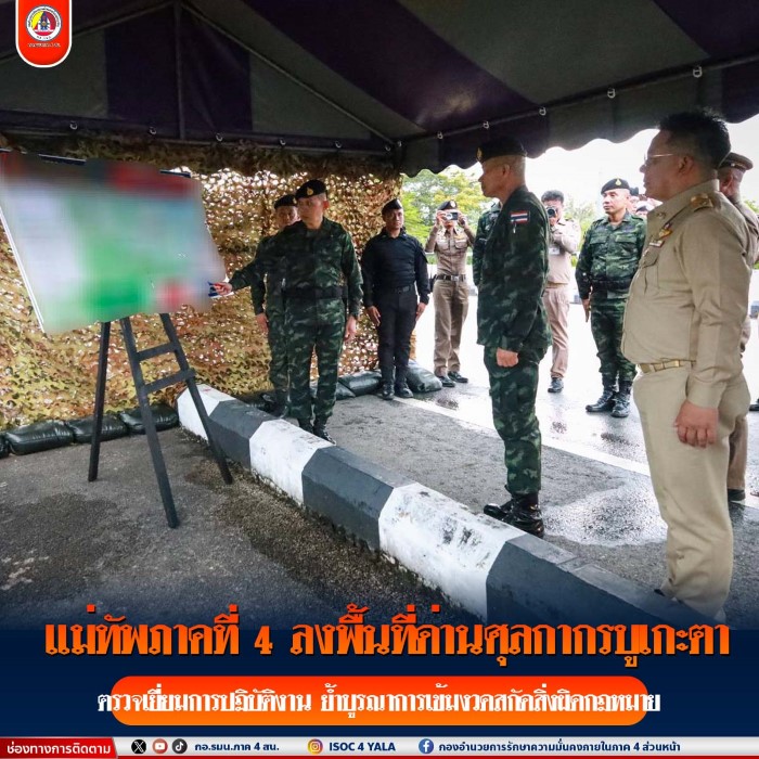 เมื่อวันที่ 17 เมษายน 2569 เวลา 16.30 น. พลโท นรธิป โพยนอก แม่ทัพภาคที่ 4 / ผู้อำนวยการรักษาความมั่นคงภายในภาค 4 เดินทางลงพื้นที่ตรวจเยี่ยมการปฏิบัติงานของเจ้าหน้าที่ ณ ด่านศุลกากรบูเกะตา บ้านบูเกะตา ตำบลโฆษิต อำเภอแว้ง จังหวัดนราธิวาส เพื่อติดตามผลการดำเนินงานและมอบนโยบายการปฏิบัติราชการในการดูแลความปลอดภัยพื้นที่รอยต่อชายแดนไทย-มาเลเซีย