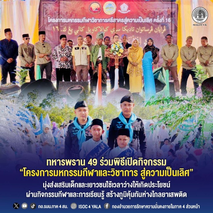 วันที่ 20 เมษายน 2569 เวลา 09:30 น. หน่วยเฉพาะกิจกรมทหารพรานที่ 49 โดย ร้อยเอก พงษ์รัตน์ วิเชียรรัตน์ ผู้บังคับกองร้อยทหารพรานที่ 4903 พร้อมด้วยกำลังพลชุดปฏิบัติการกิจการพลเรือน ร่วมกับผู้นำชุมชน ผู้นำศาสนา ครู นักเรียนตาดีกา กลุ่มเยาวชน และประชาชนในพื้นที่ เข้าร่วมพิธีเปิด “โครงการมหกรรมกีฬาวิชาการศรีสาครสู่ความเป็นเลิศ ครั้งที่ 16” ณ สนามกีฬาตาดีกาประจำมัสยิดดารุลอิฮซาน บ้านไอร์แตแต ตำบลศรีสาคร อำเภอศรีสาคร จังหวัดนราธิวาส โดยมี นายปรีชา คำนึง ปลัดอำเภอหัวหน้ากลุ่มงานบริหารงานปกครองอำเภอศรีสาคร เป็นประธานในพิธี
