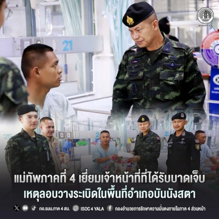 (วันที่ 21 เมษายน 2569) เวลา 08.00 น. พลโท นรธิป โพยนอก แม่ทัพภาคที่ 4 / ผู้อำนวยการรักษาความมั่นคงภายในภาค 4 เดินทางไปยังโรงพยาบาลศูนย์ยะลา เพื่อเข้าเยี่ยมและให้กำลังใจกำลังพลหน่วยเฉพาะกิจกรมทหารพรานที่ 33 (ฉก.ทพ.33) ที่ได้รับบาดเจ็บจากเหตุคนร้ายลอบวางระเบิดบริเวณหน้าทางเข้าโรงเรียนแสงทิพย์วิทยา ตำบลตาเนาะปูเต๊ะ อำเภอบันนังสตา จังหวัดยะลา เมื่อวันที่ 20 เมษายน 2569 ส่งผลให้กำลังพลได้รับบาดเจ็บ จำนวน 4 นาย ประกอบด้วย จ่าสิบเอก กันต์ศักดิ์ เตชะฤทธิ์ มีอาการแน่นหน้าอก หูอื้อ, อาสาสมัครทหารพราน อำไพรพงษ์ อุ่นถิ่น มีอาการแน่นหน้าอก ปวดคอ ปวดศีรษะโดนกระแทก หูอื้อ, อาสาสมัครทหารพราน นฤดล บุญสุวรรณ อาการ หูอื้อ ปวดต้นคอ ปวดหัว และ อาสาสมัครทหารพราน อภิสิทธิ์ ตันกาบ มีอาการ ปวดหัว ปวดคอ หัวกระแทก ขณะนี้รักษาตัว ณ โรงพยาบาลศูนย์ยะลา โดยคณะแพทย์ พยาบาล และเจ้าหน้าที่ที่เกี่ยวข้องได้รายงานอาการของผู้บาดเจ็บ และอยู่ในการดูแลของทีมแพทย์อย่างใกล้ชิด พร้อมติดตามอาการอย่างต่อเนื่อง