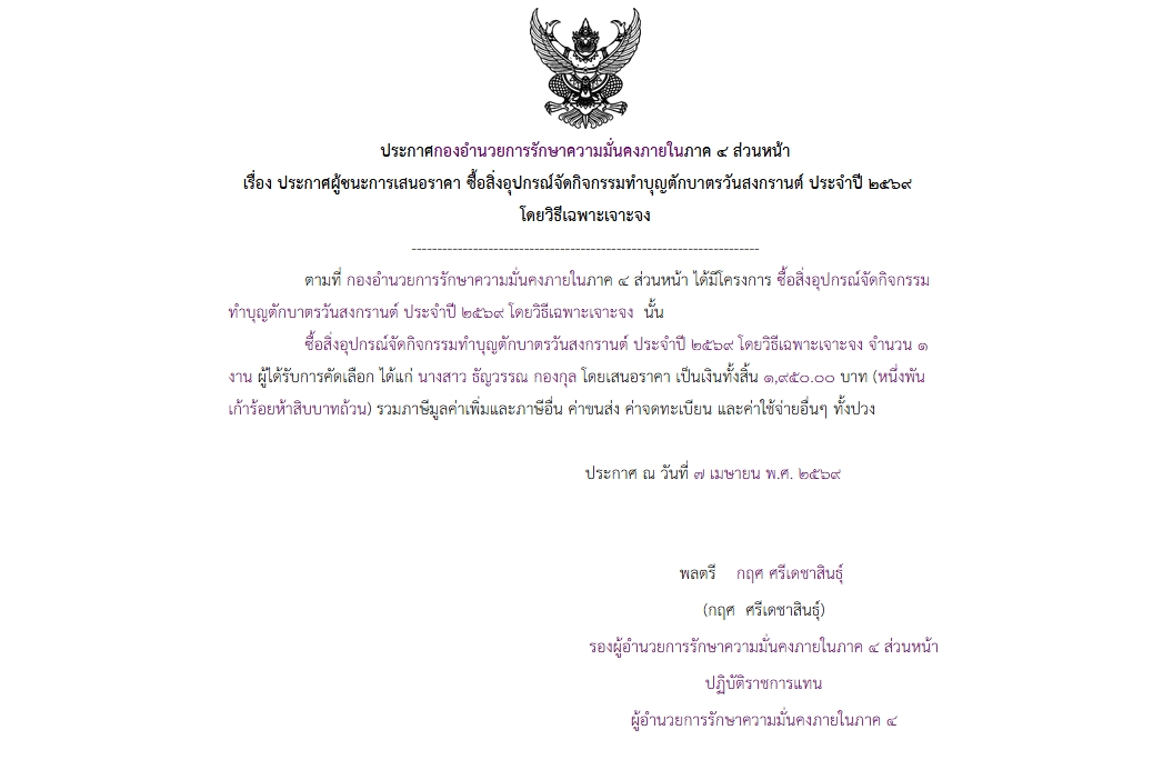 จัดซื้อ จัดจ้างประกาศผู้ชนะการเสนอราคา ประกาศกองอำนวยการรักษาความมั่นคงภายในภาค 4 ส่วนหน้า เรื่อง ประกาศผู้ชนะการเสนอราคา ซื้อสิ่งอุปกรณ์จัดกิจกรรมทำบุญตักบาตรในวันสงกรานต์ ประจำปี 2569 โดยวิธีเฉพาะเจาะจง April 21, 2026 16 Share Facebook Twitter Google+ Telegram LINE
