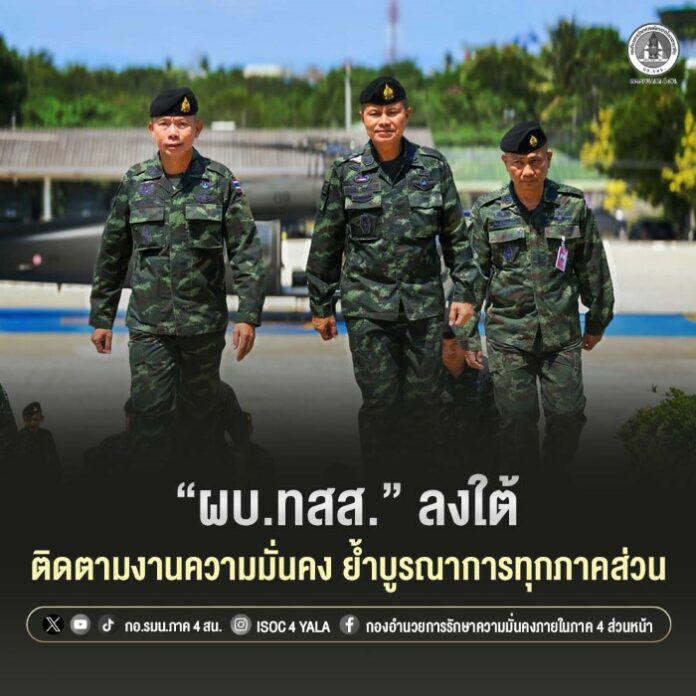 วันที่ 21 เมษายน 2569 เวลา 10.30 น. พลเอก อุกฤษฎ์ บุญตานนท์ ผู้บัญชาการทหารสูงสุด พร้อมคณะ ลงพื้นที่ติดตามการขับเคลื่อนงานด้านความมั่นคงในจังหวัดชายแดนภาคใต้ ณ ห้องประชุม 1 กองอำนวยการรักษาความมั่นคงภายในภาค 4 ส่วนหน้า ค่ายสิรินธร ตำบลเขาตูม อำเภอยะรัง จังหวัดปัตตานี โดยมี พลโท นรธิป โพยนอก แม่ทัพภาคที่ 4 / ผู้อำนวยการรักษาความมั่นคงภายในภาค 4 พร้อมคณะผู้บังคับบัญชาให้การต้อนรับ