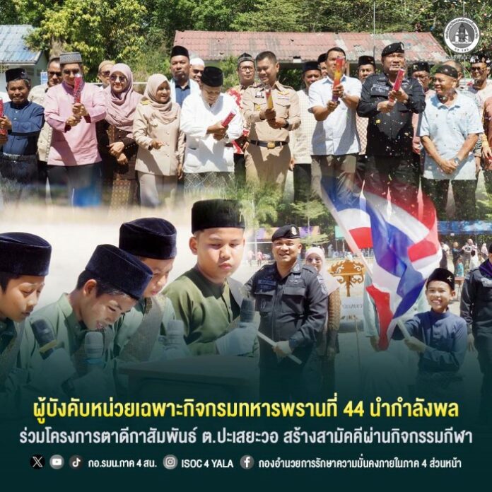 เมื่อวันที่ 20 เมษายน 2569 เวลา 10.00 น. พันเอก ณัฐวุฒิ ศรีสังข์ ผู้บังคับหน่วยเฉพาะกิจกรมทหารพรานที่ 44 (ฉก.ทพ.44) พร้อมด้วยชุดปฏิบัติการกิจการพลเรือน เข้าร่วมกิจกรรม “โครงการตาดีกาสัมพันธ์” ณ ตำบลปะเสยะวอ อำเภอสายบุรี จังหวัดปัตตานี ซึ่งจัดขึ้นระหว่างวันที่ 20 – 22 เมษายน 2569 โดยมี นายวิรัตน์ บุญจันทร์ นายอำเภอสายบุรี เป็นประธานในพิธีเปิด มีหัวหน้าส่วนราชการ ผู้นำศาสนา อาทิ โต๊ะอิหม่าม เจ๊ะฆู รวมถึงผู้นำท้องที่ ผู้นำท้องถิ่น และนักเรียนตาดีกาในพื้นที่ เข้าร่วมกิจกรรมอย่างพร้อมเพรียง