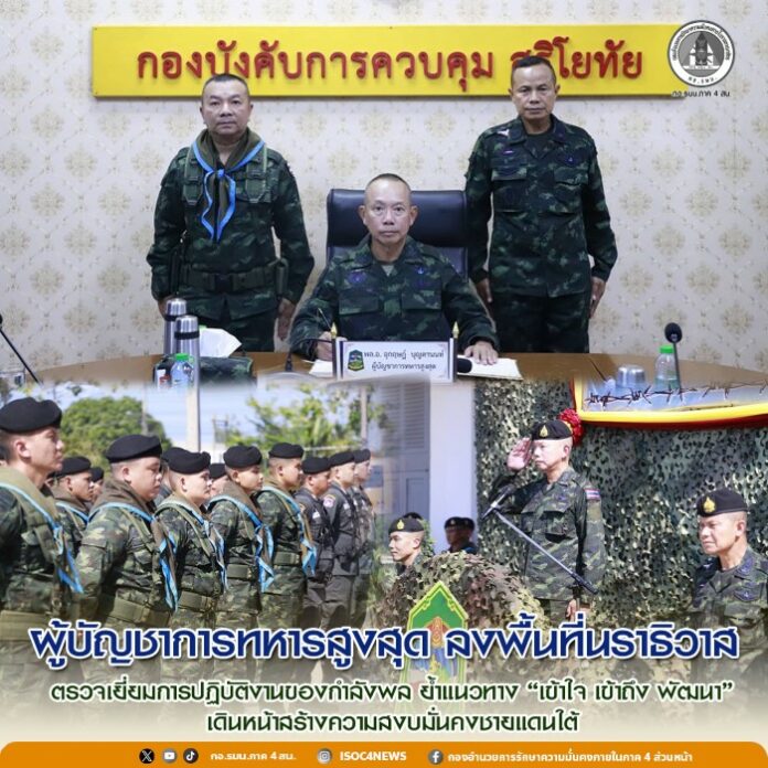 วันที่ 21 เมษายน 2569 เวลา 13.50 น. พลเอก อุกฤษฎ์ บุญตานนท์ ผู้บัญชาการทหารสูงสุด พร้อมคณะ ลงพื้นที่ตรวจเยี่ยมการปฏิบัติงาน ณ กองบังคับการควบคุมสุริโยทัย ค่ายกัลยาณิวัฒนา อำเภอเมือง จังหวัดนราธิวาส เพื่อติดตามการดำเนินงานด้านความมั่นคงในพื้นที่จังหวัดชายแดนภาคใต้ โดยมีพลโท นรธิป โพยนอก แม่ทัพภาคที่ 4 และผู้บังคับบัญชาที่เกี่ยวข้องให้การต้อนรับ