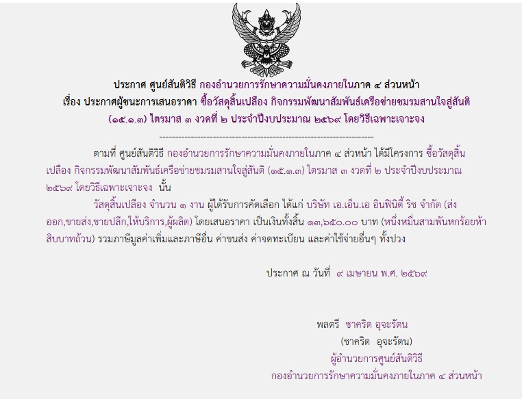 จัดซื้อ จัดจ้างประกาศผู้ชนะการเสนอราคา ประกาศผู้ชนะการเสนอราคา ซื้อวัสดุสิ้นเปลือง กิจกรรมพัฒนาสัมพันธ์เครือข่ายชมรมสานใจสู่สันติ (๑๕.๑.๓) ไตรมาศ ๓ งวดที่ ๒ ประจำปีงบประมาณ ๒๕๖๙ โดยวิธีเฉพาะเจาะจง April 22, 2026 11 Share Facebook Twitter Google+ Telegram LINE