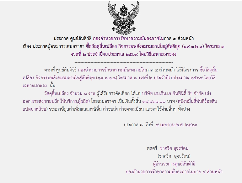 จัดซื้อ จัดจ้างประกาศผู้ชนะการเสนอราคา ประกาศผู้ชนะการเสนอราคา ซื้อวัสดุสิ้นเปลือง กิจกรรมพัฒนาสัมพันธ์เครือข่ายชมรมสานใจสู่สันติ (๑๙.๓.๒.๑) ไตรมาศ ๓ งวดที่ ๒ ประจำปีงบประมาณ ๒๕๖๙ โดยวิธีเฉพาะเจาะจง April 22, 2026 11 Share Facebook Twitter Google+ Telegram LINE