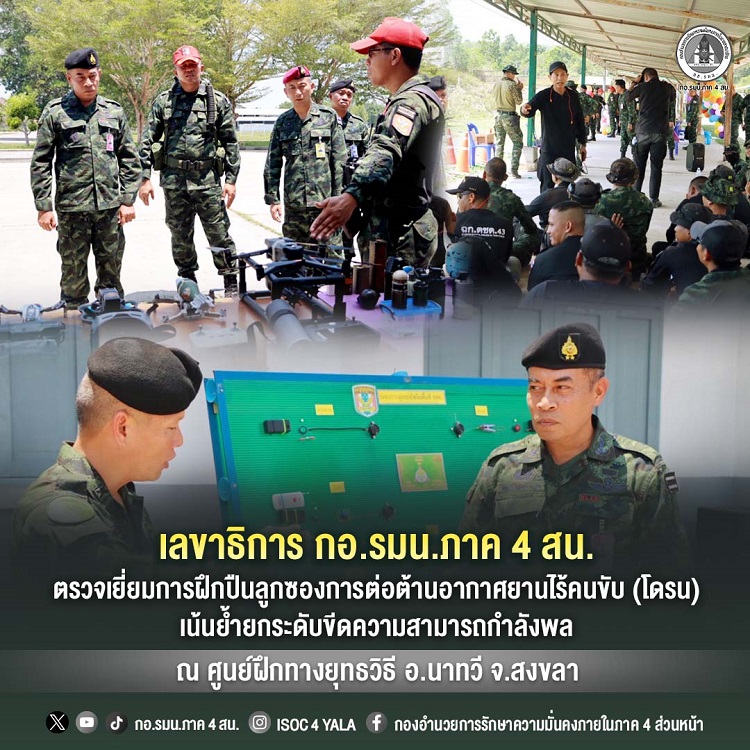 วันนี้ (22 เมษายน 2569) เวลา 10.40 น. พลตรี เฉลิมพงค์ คงบัว เลขาธิการ กองอำนวยการรักษาความมั่นคงภายในภาค 4 ส่วนหน้า พร้อมคณะฯ เดินทางตรวจเยี่ยมการฝึกหลักสูตรปืนลูกซองในการต่อต้านอากาศยานไร้คนขับ (โดรน) ณ ศูนย์ฝึกทางยุทธวิธี ค่ายมหาจักรีสิรินธร ตำบลท่าประดู่ อำเภอนาทวี จังหวัดสงขลา โดยมี ผู้บังคับศูนย์ฝึกทางยุทธวิธี พร้อมด้วย รองผู้บังคับศูนย์ฝึกทางยุทธวิธี และคณะครูฝึก ตลอดจนผู้เข้ารับการฝึกให้การต้อนรับ