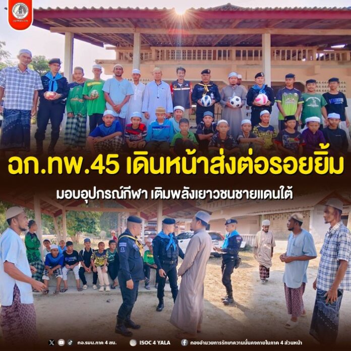 วันที่ 22 เมษายน 2569 หน่วยเฉพาะกิจกรมทหารพรานที่ 45 ร่วมกับกลุ่มดาหลาบารู ลงพื้นที่มอบอุปกรณ์กีฬาให้แก่น้อง ๆ โรงเรียนอัลมิสบาฮูลมูนิร์ บ้านลาแป ตำบลบองอ อำเภอระแงะ จังหวัดนราธิวาส เพื่อส่งเสริมสุขภาพกายและสุขภาพใจ สร้างความสามัคคี และเปิดพื้นที่สร้างสรรค์ให้เยาวชนใช้เวลาว่างให้เกิดประโยชน์ พร้อมสานสัมพันธ์อันดีระหว่างเจ้าหน้าที่กับชุมชนอย่างต่อเนื่อง