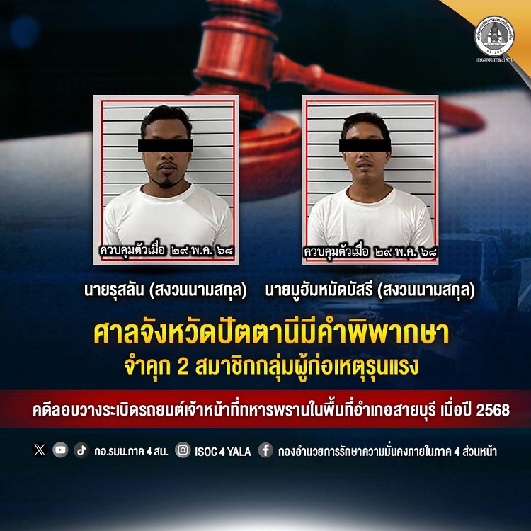 เมื่อวันที่ 23 เมษายน 2569 ศาลจังหวัดปัตตานีอ่านคำพิพากษา ในคดีหมายเลขดำที่ อ.872/68 ซึ่งมี นายรุสลัน (ขอสงวนนามสกุล) เป็นจำเลยที่ 1 และนายมูฮัมหมัดบัสลี (ขอสงวนนามสกุล) เป็นจำเลยที่ 2 ในความผิดฐานอั้งยี่ สืบเนื่องจากเหตุการณ์เมื่อวันที่ 26 มีนาคม 2568 กลุ่มคนร้ายได้ก่อเหตุลอบวางระเบิดรถยนต์เจ้าหน้าที่ชุดปฏิบัติการ กองร้อยทหารพรานที่ 4416 บริเวณหมู่ที่ 5 ตำบลเตราะบอน อำเภอสายบุรี จังหวัดปัตตานี ส่งผลให้เจ้าหน้าที่ได้รับบาดเจ็บ 1 นาย โดยศาลพิจารณาแล้วเห็นว่า จำเลยทั้งสองได้ให้การรับสารภาพในชั้นดำเนินกรรมวิธีซักถาม และคำให้การในฐานะพยานเป็นประโยชน์ต่อการพิจารณาคดีอย่างมาก จึงมีเหตุบรรเทาโทษ ลดโทษให้ 1 ใน 3 จากโทษจำคุก 2 ปี คงจำคุกจำเลยทั้งสอง คนละ 1 ปี 4 เดือน และให้ขังจำเลยไว้ระหว่างอุทธรณ์ เพื่อเข้าสู่กระบวนการตามกฎหมายในลำดับต่อไป