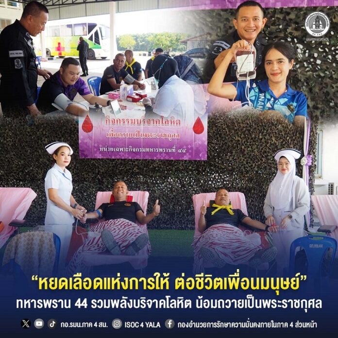 ทั้งนี้ มีกำลังพลเข้าร่วมบริจาคจำนวน 62 นาย ณ กองบังคับการกรมทหารพรานที่ 44 ตำบลปะเสยะวอ อำเภอสายบุรี จังหวัดปัตตานี แสดงออกถึงพลังแห่งความเสียสละ และความห่วงใยที่มีต่อประชาชนอย่างแท้จริง