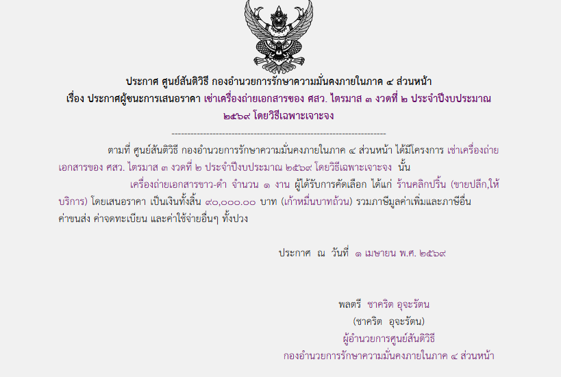 จัดซื้อ จัดจ้างประกาศผู้ชนะการเสนอราคา ประกาศผู้ชนะการเสนอราคา เช่าเครื่องถ่ายเอกสารของ ศสว. ไตรมาส ๓ งวดที่ ๒ ประจำปีงบประมาณ ๒๕๖๙ โดยวิธีเฉพาะเจาะจง April 24, 2026 9 Share Facebook Twitter Google+ Telegram LINE