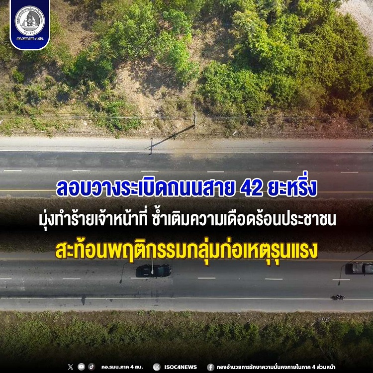 กองอำนวยการรักษาความมั่นคงภายในภาค 4 ส่วนหน้า ขอความร่วมมือพี่น้องประชาชน หากพบเบาะแส รวมถึงบุคคลต้องสงสัยเข้ามาเคลื่อนไหวในพื้นที่ สามารถแจ้งได้ที่หมายเลขโทรศัพท์สายด่วน กอ.รมน.ภาค 4 สน. 1341 และหน่วยเฉพาะกิจในพื้นที่ได้ตลอด 24 ชั่วโมง เพื่อร่วมกันเฝ้าระวังและสร้างสันติสุขในพื้นที่อย่างยั่งยืน