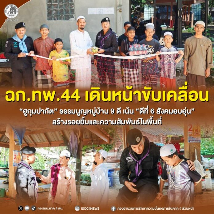 พันเอก ณัฐวุฒิ ศรีสังข์ ผู้บังคับหน่วยเฉพาะกิจกรมทหารพรานที่ 44 มอบหมายให้ ร้อยตรี ปิยะศักดิ์ สายสิญจน์ ผู้บังคับกองร้อยทหารพรานที่ 4416 นำกำลังพลชุดปฏิบัติการกิจการพลเรือน ลงพื้นที่ปอเนาะฟักรียาห์อุสมานียะห์ บ้านปาเซปูเต๊ะ ตำบลปากู อำเภอทุ่งยางแดง จังหวัดปัตตานี พบปะเยี่ยมเยียนบุคลากรทางการศึกษาและนักเรียน เพื่อมุ่งสร้างความเข้าใจอันดี เสริมความสัมพันธ์ระหว่างเจ้าหน้าที่กับชุมชน พร้อมเปิดพื้นที่พูดคุยแลกเปลี่ยนข้อมูลข่าวสาร และมอบอุปกรณ์กีฬาให้แก่นักเรียน เพื่อส่งเสริมสุขภาพที่ดีและใช้เวลาว่างให้เกิดประโยชน์