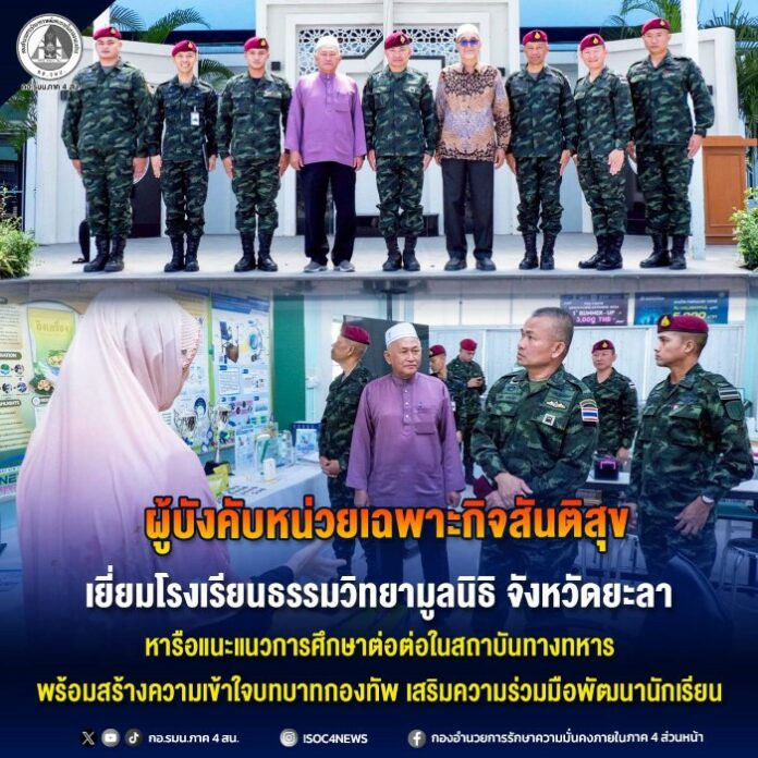 พลตรี เสด็จ อาคะจักร ผู้บังคับหน่วยเฉพาะกิจสันติสุข พร้อมคณะ และ พันโท น้ำมนต์ คงชุ่ม ผู้บังคับชุดควบคุมที่ 953 หน่วยเฉพาะกิจสันติสุข ลงพื้นที่เข้าพบและเยี่ยมเยียน อาจารย์รอซี เบ็ญสุหลง ผู้อำนวยการโรงเรียนธรรมวิทยามูลนิธิ จังหวัดยะลา เพื่อพูดคุยแลกเปลี่ยนแนวทางด้านการศึกษาและการพัฒนาเยาวชนในพื้นที่ ซึ่งการพบปะครั้งนี้ได้มีการหารือเกี่ยวกับการแนะแนวการศึกษาต่อในสถาบันทางทหาร อาทิ โรงเรียนนายร้อยพระจุลจอมเกล้า และโรงเรียนนายสิบทหารบก เพื่อเปิดโอกาสให้นักเรียนที่มีความสนใจได้มีทางเลือกในการศึกษาต่อและประกอบอาชีพในอนาคต นอกจากนี้ ยังมีการสร้างความเข้าใจที่ถูกต้องเกี่ยวกับบทบาทของกองทัพในการมีส่วนร่วมพัฒนาประเทศ ตลอดจนการอยู่ร่วมกันอย่างสันติในสังคมพหุวัฒนธรรม ซึ่งเป็นประเด็นสำคัญในพื้นที่จังหวัดชายแดนภาคใต้