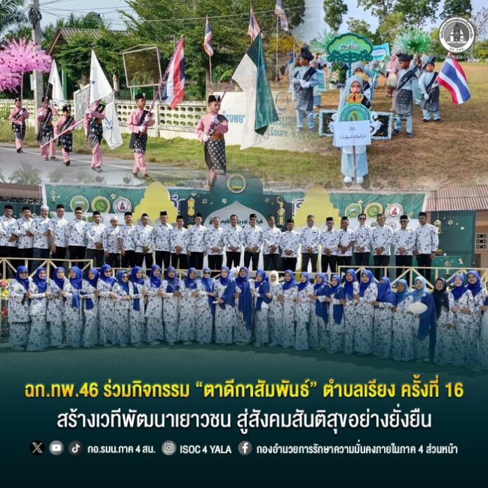 วันที่ 25 เมษายน 2569 เวลา 09:00 น. กองร้อยทหารพรานที่ 4602 หน่วยเฉพาะกิจกรมทหารพรานที่ 46 นำโดย ร้อยตรี วิริยะชัย วินาโล พร้อมกำลังพลชุดปฏิบัติการกิจการพลเรือน ร่วมกับส่วนราชการ ผู้นำศาสนา ผู้นำท้องที่ ผู้นำท้องถิ่น เยาวชน และประชาชนในพื้นที่ จัดกิจกรรม “ตาดีกาสัมพันธ์” ตำบลเรียง ครั้งที่ 16 ณ สนามกีฬาโรงเรียนดารุสซาลัม บ้านสุเป๊ะ ตำบลเรียง อำเภอรือเสาะ จังหวัดนราธิวาส โดยมี นายนิซายาดีย์ หลีตอสัน ผู้อำนวยการสำนักงานการศึกษาเอกชนอำเภอรือเสาะ เป็นประธานในพิธีเปิด ซึ่งจัดขึ้นระหว่างวันที่ 25 – 27 เมษายน 2569 เพื่อส่งเสริมการเรียนรู้ของเด็กและเยาวชนในโรงเรียนตาดีกา ปลูกฝังคุณธรรมตามหลักศาสนา เสริมสร้างวินัย ทักษะชีวิต และความสามัคคี พร้อมทั้งสร้างความสัมพันธ์อันดีระหว่างเจ้าหน้าที่กับชุมชน