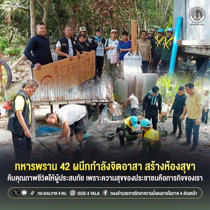 วันที่ 26 เมษายน 2569 ณ บ้านเลขที่ 125 บ้านคลองโต๊ะเนาะ หมู่ที่ 3 ตำบลสะกำ อำเภอมายอ จังหวัดปัตตานี หน่วยเฉพาะกิจกรมทหารพรานที่ 42 โดย ร้อยโท สิทธิกรณ์ ศรีสุขโข ผู้บังคับกองร้อยทหารพรานที่ 4204 มอบหมายกำลังพลชุดช่างจิตอาสาของหน่วย ร่วมกับอาสาสมัครชุดคุ้มครองตำบลสะกำ ลงพื้นที่ดำเนินการก่อสร้างห้องสุขา เพื่อช่วยเหลือครอบครัวของ นางสาวซากีพะโตะมง ผู้ได้รับผลกระทบอย่างหนักจากเหตุอุทกภัยที่ผ่านมา จนบ้านเรือนได้รับความเสียหายจากน้ำท่วมและต้นไม้ใหญ่ล้มทับ