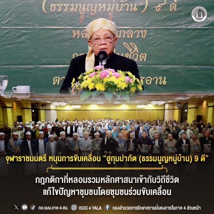 เมื่อวันที่ 27 เมษายน 2569 ณ ห้องน้ำพราว 1 โรงแรมซีเอส ปัตตานี จังหวัดปัตตานี ศูนย์อำนวยการบริหารจังหวัดชายแดนภาคใต้ ร่วมกับสำนักงานคณะกรรมการอิสลามประจำจังหวัดในพื้นที่ 5 จังหวัดชายแดนภาคใต้, สมาคมสถาบันปอเนาะ 5 จังหวัดชายแดนภาคใต้ และกองอำนวยการรักษาความมั่นคงภายในภาค 4 ส่วนหน้า ผนึกกำลังร่วมกันประชุมขับเคลื่อนงาน “ฮูกุมปากัต (ธรรมนูญหมู่บ้าน) 9 ดี“ ในพื้นที่จังหวัดภาคใต้ ภายในงานได้รับเกียรติจาก นายอรุณ บุญชม จุฬาราชมนตรี เป็นประธานเปิดงาน และปาฐกถาพิเศษในกิจกรรมขับเคลื่อนงาน “ฮูกุมปากัต (ธรรมนูญหมู่บ้าน) 9 ดี” ในพื้นที่จังหวัดชายแดนภาคใต้ โดยมี พลตรี ชาคริต อุจะรัตน รองแม่ทัพภาคที่ 4 / รองผู้อำนวยการรักษาความมั่นคงภายในภาค 4 ส่วนหน้า, นายปิยะศิริ วัฒนวรางกูร เลขาธิการศูนย์อำนวยการบริหารจังหวัดชายแดนภาคใต้ พร้อมด้วยคณะผู้บริหารและผู้นำศาสนา ส่วนราชการในพื้นที่ร่วมประชุมเพื่อขับเคลื่อนสร้างความสงบสุขให้เกิดขึ้นในพื้นที่อย่างเป็นรูปธรรม