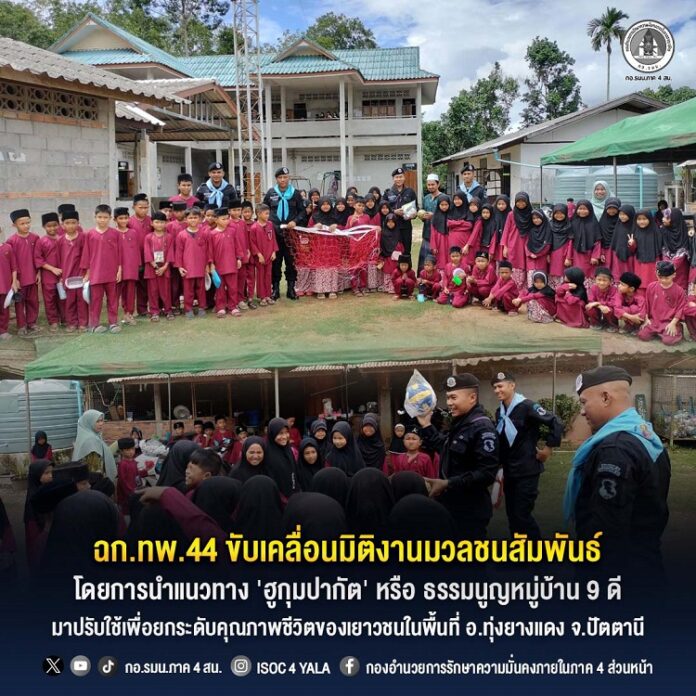 กำลังพลจากกองร้อยทหารพรานที่ 4416 หน่วยเฉพาะกิจกรมทหารพรานที่ 44 ได้ลงพื้นที่ไปยังโรงเรียนตาดีกาดารุลอามาน บ้านเขาดิน เพื่อเข้าพบปะพูดคุยและสร้างความเข้าใจกับคณะผู้บริหาร ครู และ นักเรียน โดยมีการให้ความรู้และแลกเปลี่ยนความคิดเห็น พร้อมเน้นย้ำความสำคัญของ ฮูกุมปากัต หรือ ธรรมนูญหมู่บ้าน 9 ดี ใน 3 ด้านหลัก คือ การมุ่งเน้นให้เยาวชนเป็นคนดี, มีสติปัญญา และร่วมกันสร้างสังคมที่อบอุ่น