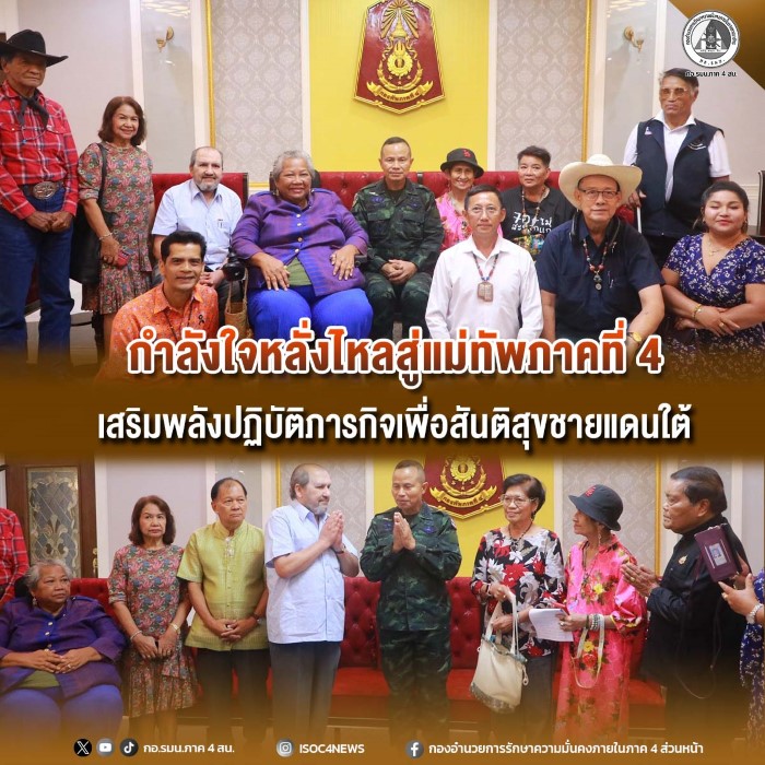 ทั้งนี้ เพื่อสนับสนุนการปฏิบัติหน้าที่ของแม่ทัพภาคที่ 4 ในการดูแลความสงบเรียบร้อย และสร้างสันติสุขอย่างยั่งยืนในพื้นที่จังหวัดชายแดนภาคใต้ โดยมี พลตรี เฉลิมพร ขำเขียว รองแม่ทัพภาคที่ 4 , พันเอก สุวัฒน์ ทองใบ รองเสนาธิการกองทัพภาคที่ 4 และพันเอก สุริน ทองเต็ม ผู้อำนวยการกองกิจการพลเรือนกองทัพภาคที่ 4 ร่วมให้การต้อนรับ