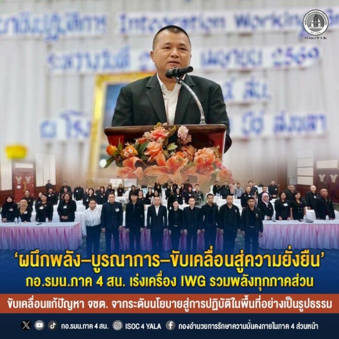 วันนี้ 29 เมษายน 2569 พลตรี อนุชา โนนคู่เขตโขง ผู้อำนวยการส่วนพัฒนายุทธศาสตร์ กองอำนวยการรักษาความมั่นคงภายในภาค 4 ส่วนหน้า เป็นประธานการสัมมนาทบทวน ติดตาม และประเมินผลการบูรณาการแผนแม่บทภายใต้ยุทธศาสตร์ชาติ ประจำปีงบประมาณ 2569 ภายใต้กลไกการขับเคลื่อนการแก้ไขปัญหาจังหวัดชายแดนภาคใต้ (Integration Working Groups: IWG) ระหว่างวันที่ 27–29 เมษายน 2569 ณ โรงแรมบีพี สมิหลา บีช อำเภอเมือง จังหวัดสงขลา โดยมี อาจารย์วาริน นาราวิทย์ ที่ปรึกษาส่วนพัฒนายุทธศาสตร์ กองอำนวยการรักษาความมั่นคงภายในภาค 4 ส่วนหน้า ผู้ช่วยอธิการบดีมหาวิทยาลัยนราธิวาสราชนครินทร์ พร้อมด้วยผู้แทนจากหน่วยงานที่เกี่ยวข้องทั้งภายในและภายนอกโครงสร้าง เข้าร่วมสัมมนา รวมทั้งสิ้น 120 คน