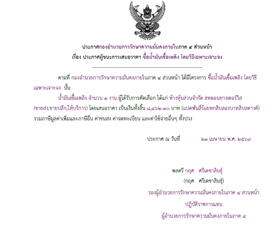 จัดซื้อ จัดจ้างประกาศผู้ชนะการเสนอราคา ประกาศกองอำนวยการรักษาความมั่นคงภายในภาย 4 ส่วนหน้า เรื่อง ประกาศผู้ชนะการเสนอราคา ซื้อน้ำมันเชื้อเพลิง โดยวิธีเฉพาะเจาะจง April 30, 2026 5 Share Facebook Twitter Google+ Telegram LINE