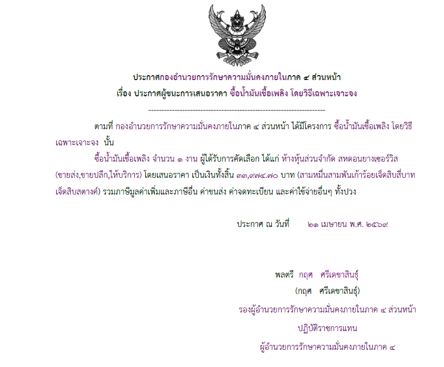 จัดซื้อ จัดจ้างประกาศผู้ชนะการเสนอราคา ประกาศกองอำนวยการรักษาความมั่นคงภายในภาย 4 ส่วนหน้า เรื่อง ประกาศผู้ชนะการเสนอราคา ซื้อน้ำมันเชื้อเพลิง โดยวิธีเฉพาะเจาะจง April 30, 2026 10 Share Facebook Twitter Google+ Telegram LINE
