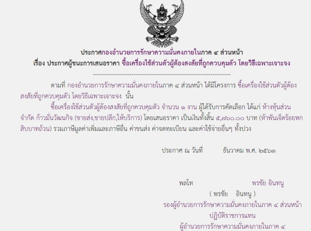 จัดซื้อ จัดจ้างประกาศผู้ชนะการเสนอราคา ประกาศผู้ชนะการเสนอราคา ซื้อเครื่องใช้ส่วนตัวผู้ต้องสงสัยที่ถูกควบคุมตัว โดยวิธีเฉพาะเจาะจง (5,760.00) February 23, 2021 1185 Share Facebook Twitter Google+ Telegram LINE สกบ.กอ.รมน.ภาค 4 สน.