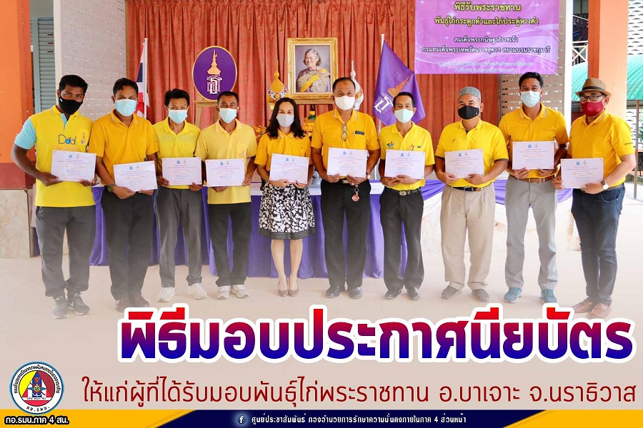วันนี้ (23 กุมภาพันธ์ 2564) เวลา 10.00 น. ที่โรงเรียนราชประชานุเคราะห์ 9 อำเภอบาเจาะ จังหวัดนราธิวาส กองสานใจสู่สันติ ศูนย์สันติวิธี จัดพิธีมอบประกาศนียบัตรให้แก่ผู้ที่ได้รับมอบพันธุ์ไก่พระราชทานเบื้องหน้าพระบรมฉายาลักษณ์ สมเด็จพระกนิษฐาธิราชเจ้า กรมสมเด็จพระเทพรัตนราชสุดาฯ สยามบรมราชกุมารี โดยมี นายประเสริฐ บือสาแม สาธารณสุขอำเภอบาเจาะ เป็นประธานในพิธี พร้อมด้วย พันเอก พรรษิษฐ์ สุพรรณชนะบุรี ผู้อำนวยการกองพาคนกลับบ้าน ศูนย์สันติวิธี, นายพัศดี พงศารุจิรัตน์ ผู้อำนวยการโรงเรียนราชประชานุเคราะห์ 9, หัวหน้าส่วนราชการ, เจ้าหน้าที่ศูนย์สันติวิธี, คณะครูโรงเรียนราชประชานุเคราะห์ 9 และสมาชิกชมรมสานใจสู่สันติ / ศูนย์ประชาชนพันธุ์ดี ร่วมพิธีโดยพร้อมเพรียง