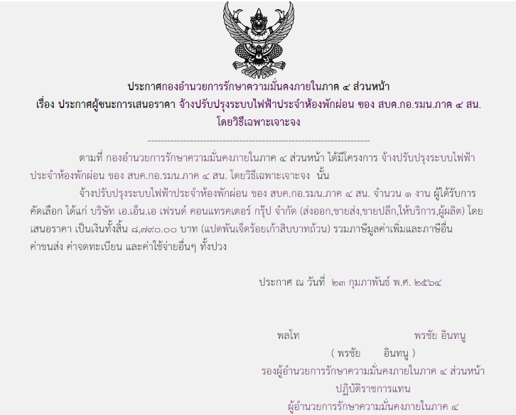 ประกาศผู้ชนะการเสนอราคา จ้างปรับปรุงระบบไฟฟ้าประจำห้องพักผ่อน ของ สบค.กอ.รมน.ภาค ๔ สน.โดยวิธีเฉพาะเจาะจง (8,790.00)