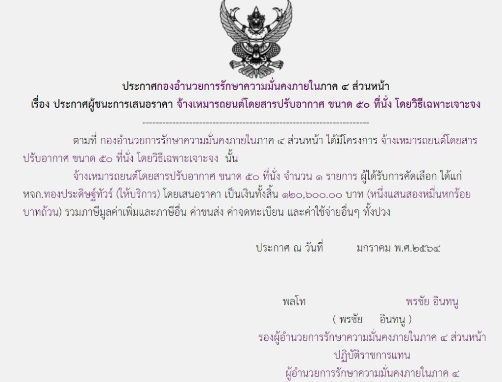 จัดซื้อ จัดจ้างประกาศผู้ชนะการเสนอราคา ประกาศผู้ชนะการเสนอราคา จ้างเหมารถยนต์โดยสารปรับอากาศ ขนาด ๕๐ ที่นั่ง โดยวิธีเฉพาะเจาะจง (120,600.00)(2) February 26, 2021 656 Share Facebook Twitter Google+ Telegram LINE สกบ.กอ.รมน.ภาค 4 สน.