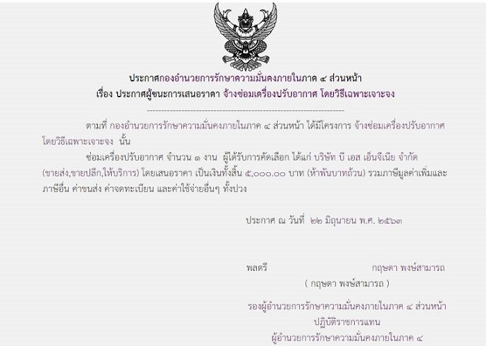 ประกาศผู้ชนะการเสนอราคา จ้างซ่อมเครื่องปรับอากาศ โดยวิธีเฉพาะเจาะจง(๑)