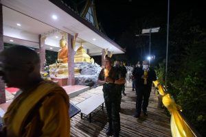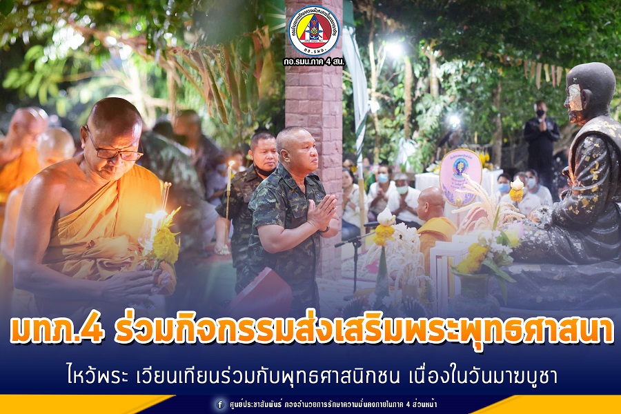 เมื่อวันที่ 26 กุมภาพันธ์ 2564 ที่เจดีย์หลวงพ่อทวดหนอน อำเภอปะนาเระ จังหวัดปัตตานี พลโท เกรียงไกร ศรีรักษ์ แม่ทัพภาคที่ 4/ ผู้อำนวยการรักษาความมั่นคงภายในภาค 4 ร่วมกับพุทธศาสนิกชนในพื้นที่ ไหว้พระสวดมนต์ และร่วมประกอบพิธีเวียนเทียนรอบองค์พระเจดีย์ เนื่องใน วันมาฆบูชา ตรงกับวันขึ้น 15 ค่ำ เดือน 3 ทั้งนี้เพื่อให้พุทธศาสนิกชนได้ร่วมกันน้อมรำลึกถึงความสำคัญทางพระพุทธศาสนาและน้อมนำหลักธรรมที่เกี่ยวข้องเป็นแนวทางในการดำเนินชีวิต ทั้งยังเป็นการส่งเสริมเผยแผ่พระพุทธศาสนาให้คงอยู่สืบไป ก่อนร่วมพบปะพูดคุยกับพี่น้องประชาชนที่มาร่วมกิจกรรม สร้างความเชื่อมั่นและเป็นขวัญกำลังใจแก่พี่น้องประชาชนในพื้นที่ โดยเฉพาะการดูแลด้านความปลอดภัย เจ้าหน้าที่ทุกคนพร้อมร่วมทุกข์ ร่วมสุข สร้างสันติสุขอย่างยั่งยืนตลอดไป