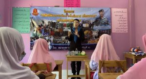 กิจกรรมโครงการ “เสริมทักษะภาษาไทย สร้างโอกาส เพื่ออนาคต” หน่วยเฉพาะกิจยะลา ซึ่งหน่วยเฉพาะกิจกรมทหารพรานที่ 41 ได้ดำเนินการจัดกิจกรรมขึ้นอย่างต่อเนื่อง เพื่อเพิ่มประสิทธิภาพผู้เรียน ที่พูด อ่าน เขียน ให้มีพัฒนาการที่ดีขึ้น รวมถึงปลูกจิตสำนึกในความรักชาติ ศาสนา พระมหากษัตริย์ ให้กับเยาวชนในสถานศึกษาพื้นที่ อำเภอรามัน จังหวัดยะลา ซึ่งชุดปฏิบัติการกิจการพลเรือนหมวดทหารพรานหญิง พร้อมด้วยชุดปฏิบัติการกิจการพลเรือนกองร้อยทหารพรานที่รับผิดชอบพื้นที่ ร่วมกันดำเนินกิจกรรมดังกล่าว และเมื่อวันที่ 27 กุมภาพันธ์ 2564 ได้จัดกิจกรรมขึ้น ณ ศูนย์การศึกษาประจำมัสยิด (ตาดีกา) อัตตัรบียาตูลอิสลามียะห์ยือนือเร๊ะ หมู่ที่ 5 ตำบลจะกว๊ะ อำเภอรามัน จังหวัดยะลา พร้อมทั้งการสร้างการรับรู้สำนึกดีร่วมกันในการป้องกันการแพร่ระบาดของโรค โควิด-19 ซึ่งเยาวชนมีความเข้าใจและตื่นรู้ต่อมาตรการดังกล่าว และร่วมกันทำเจลล้างมือที่สามารถ ผลิตเองได้ภายในชุมชน เพื่อลดรายจ่ายในครัวเรือน ในการจัดซื้อจัดหาเจลล้างมือ ป้องกันการแพร่ระบาดของโรค โควิด-19