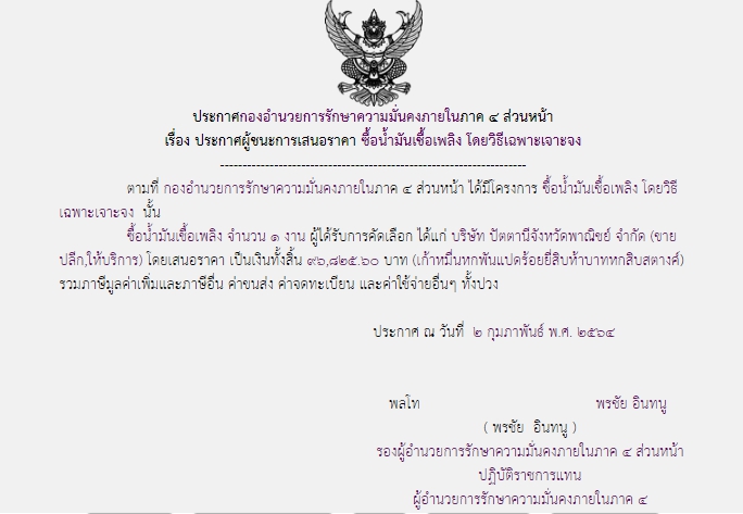 ประกาศผู้ชนะการเสนอราคา ซื้อน้ำมันเชื้อเพลิง โดยวิธีเฉพาะเจาะจง (96,825.60)