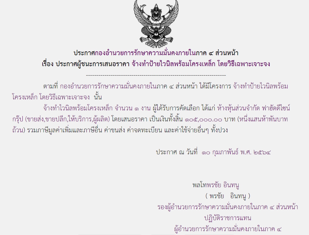 จัดซื้อ จัดจ้างประกาศผู้ชนะการเสนอราคา ประกาศผู้ชนะการเสนอราคา จ้างทำป้ายไวนิลพร้อมโครงเหล็ก โดยวิธีเฉพาะเจาะจง ( ๑๐๕,๐๐๐.๐๐ บาท ) March 3, 2021 753 Share Facebook Twitter Google+ Telegram LINE กอ.รมน.ภาค ๔ สน.