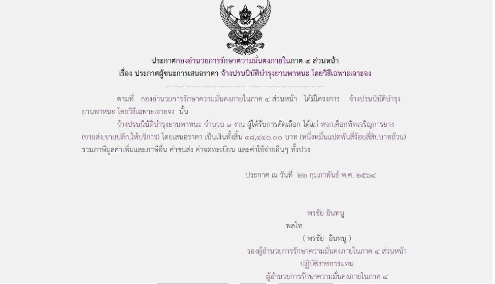 ประกาศผู้ชนะการเสนอราคา จ้างปรนนิบัติบำรุงพาหนะ โดยวิธีเฉพาะเจาะจง ( ๑๘,๔๔๐.๐๐ บาท )