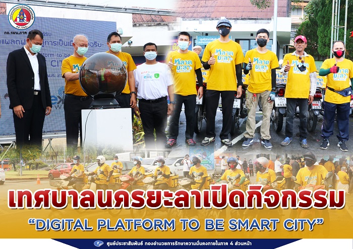 วันนี้ (4 มีนาคม 2564) เวลา 09.30 น. ที่บริเวณหน้าสำนักทะเบียนท้องถิ่น เทศบาลนครยะลา อำเภอเมือง จังหวัดยะลา นายชัยสิทธิ์ พานิชพงศ์ ผู้ว่าราชการจังหวัดยะลา เป็นประธานในพิธีเปิดกิจกรรม “Digital platform to be smart city (ดิจิตอลแพลตฟอร์มสู่การเป็นเมืองอัจฉริยะ)” โดยมี นายสมหมาย ลูกอินทร์ รองปลัดเทศบาล รักษาราชการแทน ปลัดเทศบาล ปฏิบัติหน้าที่ นายกเทศมนตรีนครยะลา, หัวหน้าส่วนราชการ ,ประธานชุมชนในเขตเทศบาลนครยะลา, สื่อมวลชน เข้าร่วมพิธีในครั้งนี้