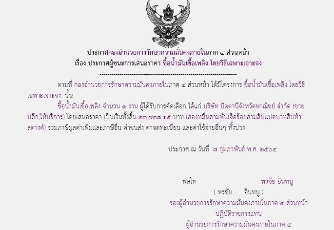 ประกาศผู้ชนะการเสนอราคา ซื้อน้ำมันเชื้อเพลิง โดยวิธีเฉพาะเจาะจง ( ๒๓,๗๓๘.๑๕ บาท )