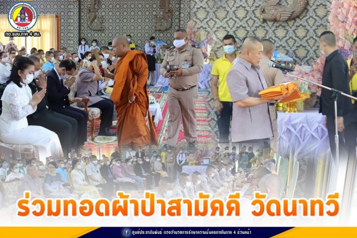 วันนี้ 5 มีนาคม 2564 เวลา 09.30 น. ที่ วัดนาทวี อำเภอนาทวี จังหวัดสงขลา พลเรือเอก ชาติชาย ศรีวรขาน ผู้บัญชาการทหารเรือ เดินทางเป็นประธานในพิธีทอดผ้าป่าสามัคคี เพื่อนำเงินปัจจัยสมทบทุนสร้างพระพุทธรูปปางมารวิชัย พร้อมแท่นสำหรับให้พุทธศาสนิกชนได้กราบไหว้สักการะบูชา โดยมี พลโท เกรียงไกร ศรีรักษ์ แม่ทัพภาคที่ 4 /ผู้อำนวยการรักษาความมั่นคงภายในภาค 4 ร่วมพิธี พร้อมด้วย ส่วนราชการ ทหาร ตำรวจ พุทธศาสนิกชนในพื้นที่ เข้าร่วมพิธีถวายปัจจัยเป็นจำนวนมาก เพื่อเป็นพุทธบูชา รวมเป็นเงินทั้งสิ้น จำนวน 3,025,653 บาท ทั้งนี้เพื่อเป็นการทำนุบำรุงศาสนสถาน พัฒนาวัดนาทวีให้เป็นจุดศูนย์รวมจิตใจ ของพี่น้องประชาชนไทยพุทธในพื้นที่ ทั้งยังเป็นการสืบทอดประเพณีอันดีงามทางพระพุทธศาสนาอีกทางหนึ่งด้วย