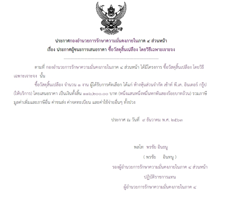 จัดซื้อ จัดจ้างประกาศผู้ชนะการเสนอราคา ประกาศผู้ชนะการเสนอราคา ซื้อวัสดุสิ้นเปลือง โดยวิธีเฉพาะเจาะจง ( ๑๑๖,๒๐๐.๐๐ บาท ) March 13, 2021 1016 Share Facebook Twitter Google+ Telegram LINE กอ.รมน.ภาค ๔ สน.