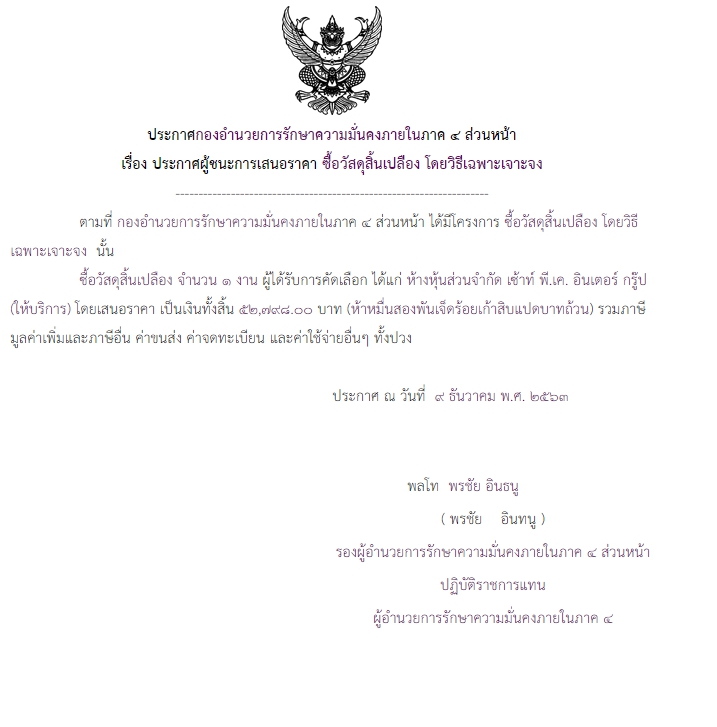ประกาศผู้ชนะการเสนอราคา ซื้อวัสดุสิ้นเปลือง โดยวิธีเฉพาะเจาะจง ( ๕๒,๗๙๘.๐๐ บาท )
