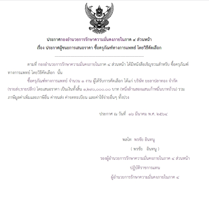 ประกาศผู้ชนะการเสนอราคา ซื้อครุภัณฑ์ทางการแพทย์ โดยวิธีคัดเลือก (1,290,000.00)