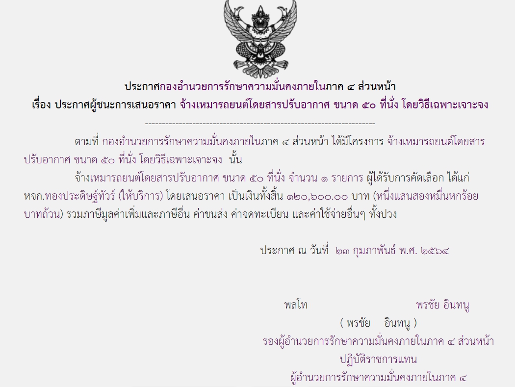 จัดซื้อ จัดจ้างประกาศผู้ชนะการเสนอราคา ประกาศผู้ชนะการเสนอราคา จ้างเหมารถยนต์โดยสารปรับอากาศ ขนาด ๕๐ ที่นั่ง โดยวิธีเฉพาะเจาะจง ( ๑๒๐,๖๐๐.๐๐ บาท ) March 17, 2021 1071 Share Facebook Twitter Google+ Telegram LINE กอ.รมน.ภาค ๔ สน.