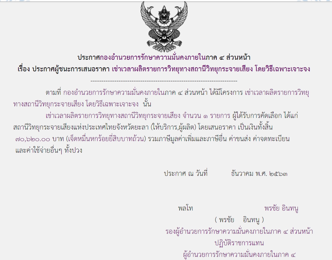 ประกาศผู้ชนะการเสนอราคา เช่าเวลาผลิตรายการวิทยุทางสถานีวิทยุกระจายเสียง โดยวิธีเฉพาะเจาะจง ( ๗๐,๖๒๐.๐๐ บาท )