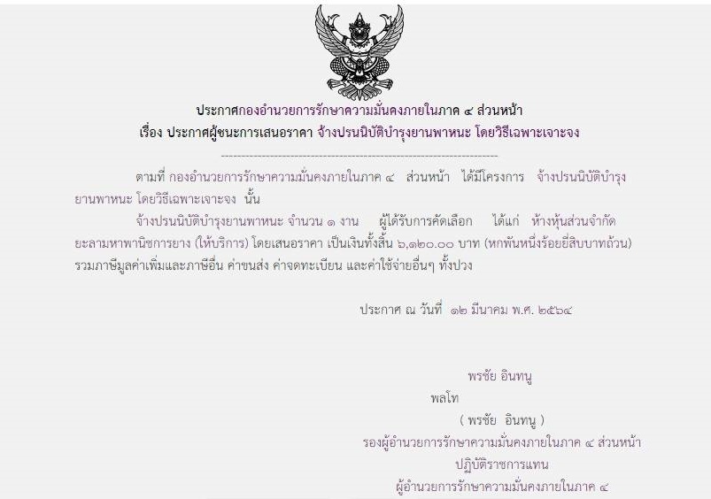 จัดซื้อ จัดจ้างประกาศผู้ชนะการเสนอราคา ประกาศผู้ชนะการเสนอราคา จ้างปรนนิบัติบำรุงยานพาหนะ โดยวิธีเฉพาะเจาะจง (6,120.00) March 20, 2021 938 Share Facebook Twitter Google+ Telegram LINE สกบ.กอ.รมน.ภาค 4 สน.