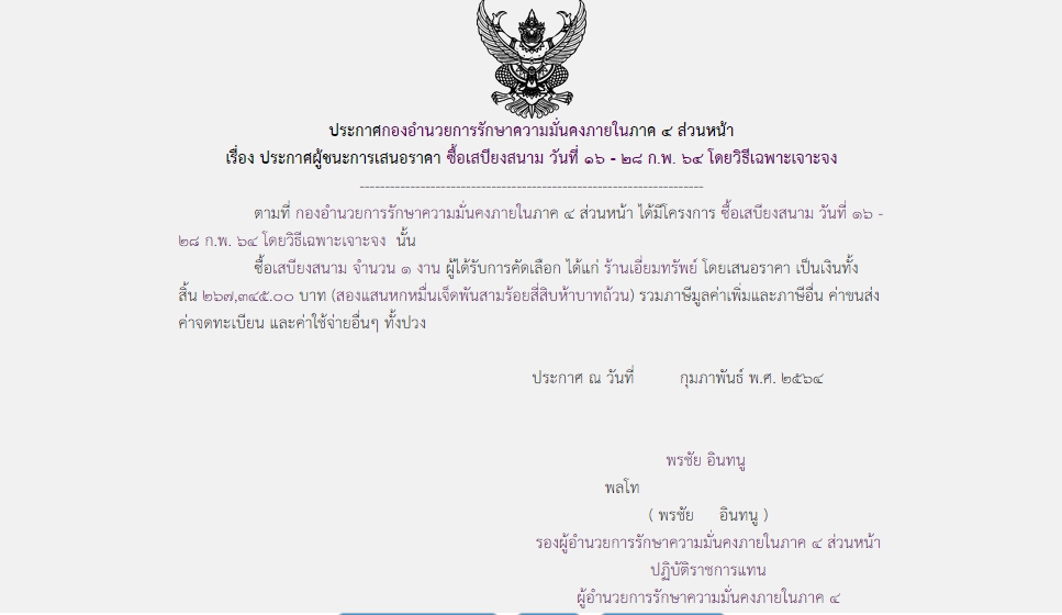 จัดซื้อ จัดจ้างประกาศผู้ชนะการเสนอราคา ประกาศผู้ชนะการเสนอราคา ซื้อเสบียงสนาม วันที่ ๑๖ – ๒๘ ก.พ.๖๔ โดยวิธีเฉพาะเจาะจง (267,345.00) March 25, 2021 830 Share Facebook Twitter Google+ Telegram LINE สกบ.กอ.รมน.ภาค 4 สน.